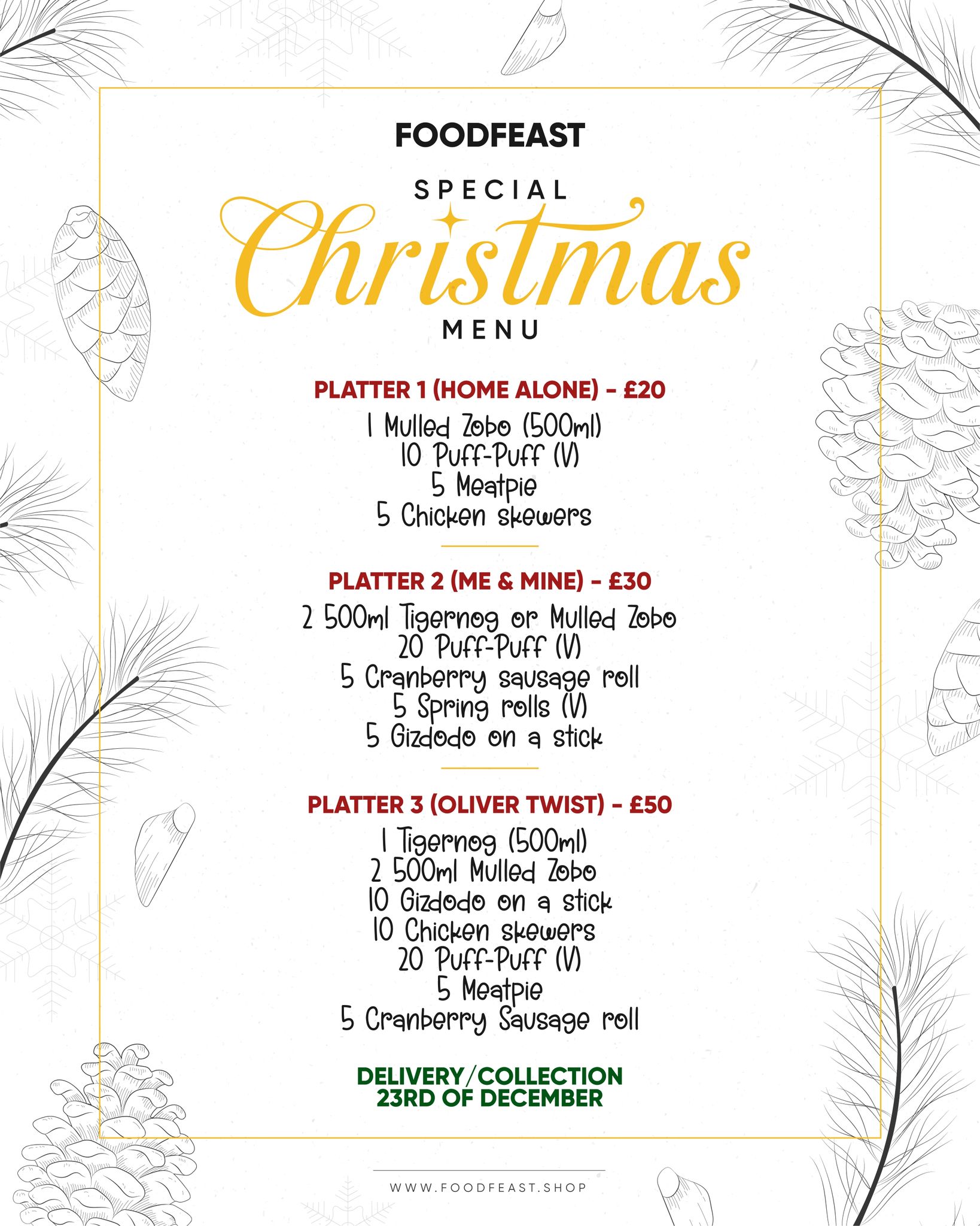 Each option is packed with delicious Afro-inspired festive treats, freshly prepared for delivery or collection on 23rd December only.