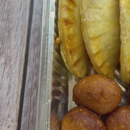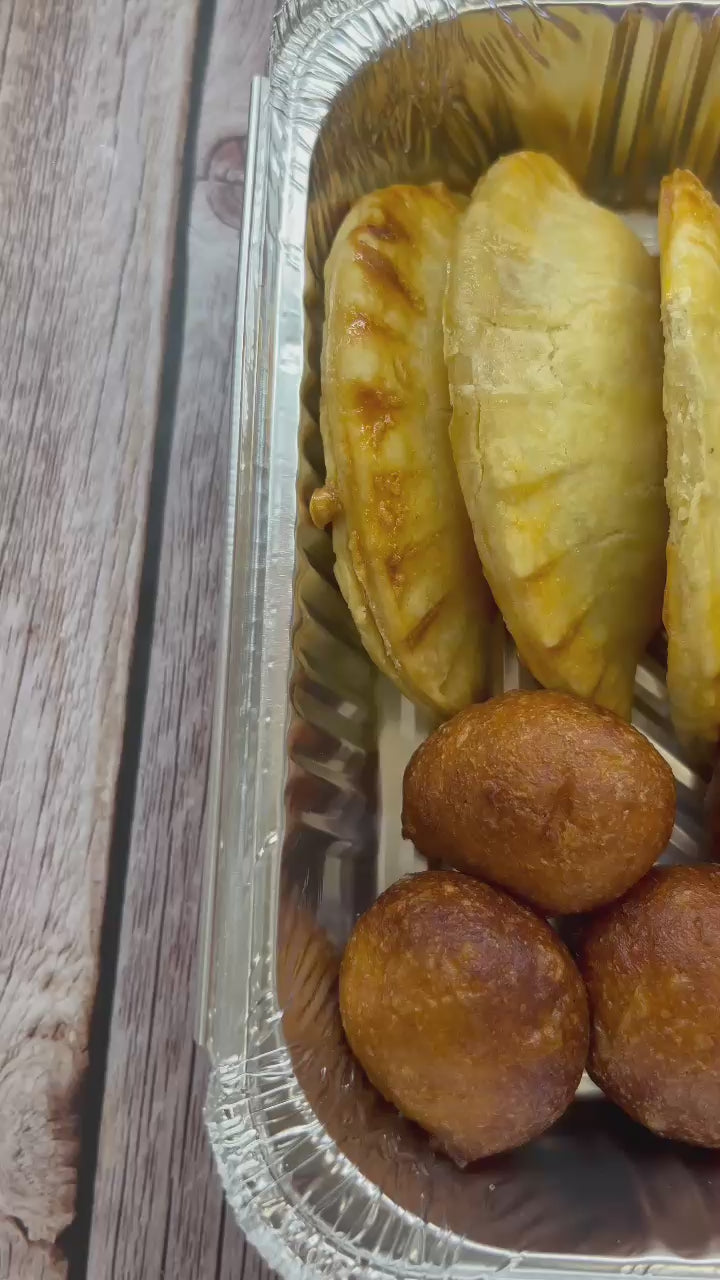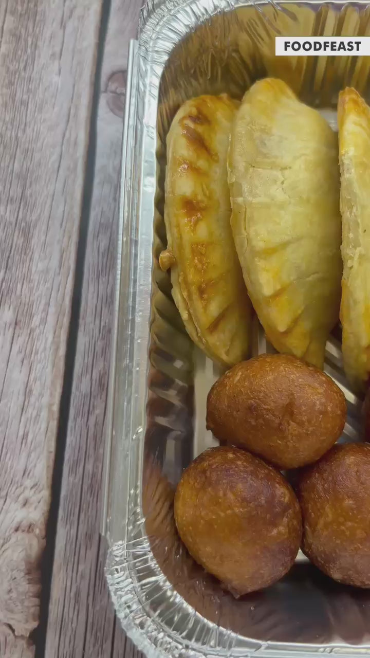 Indulge in the Solo Platter featuring a selection of 10 savoury meat pies paired with 10 delightful puff puff treats.